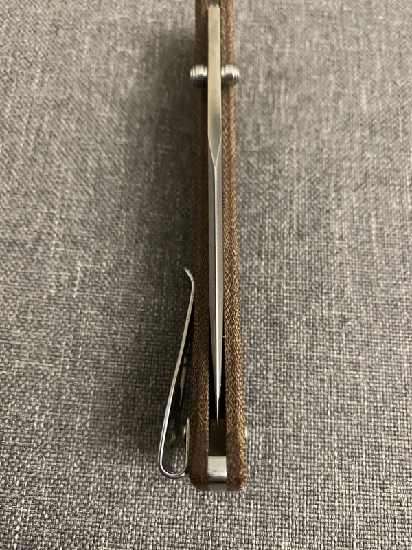 нож б/у. кастом известного мастера на не менее известный нож. рукоять теперь титан+микарта+фреймлок. пересведен тонко клинок. на клинке утрачен кончик (отражено на фото)